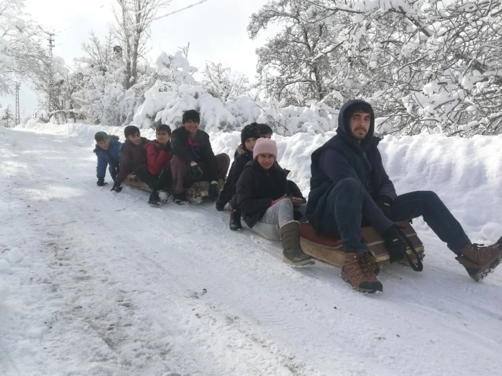 Gevaş’ta kar yağışı hayatı olumsuz etkilerken, ilçeye bağlı Elmalı Mahallesinde bir araya gelen gençler, kendi imkanlarıyla yaptıkları kızaklarla kaymanın keyfini yaşadı. Soğuğa aldırış etmeden yaklaşık iki kilometre yürüyen gençler, Artos Dağı eteklerinden başlayarak evlerinin önüne kadar kayıyorlar. Yaşları 13 ile 25 arasında değişen gençler, hafta sonu tatili olması nedeniyle zamanlarını kızakla kayarak geçirdiklerini dile getirdiler. Kızak keyfinin çocukluktan gelen ve her daim sevilen bir aktivite olduğunu belirten Halil Leyla isimli genç, “Kış aylarının vazgeçilmez eğlencelerinden olan kayak keyfini, kendi imkanımızla yaptığımız kızaklarla çıkarıyoruz. Arkadaşlarla bu keyifli günleri yaşıyoruz. Çocukluğumuzdan beri kızak kaymayı çok severiz. Kızak kaymak, çocuklardan büyüklere kadar herkesin sevdiği aktivitelerden biridir. Kayak merkezlerine gidecek imkanımız olmadığı için bizler de mecburen mahalle yollarında kayıyoruz” dedi.