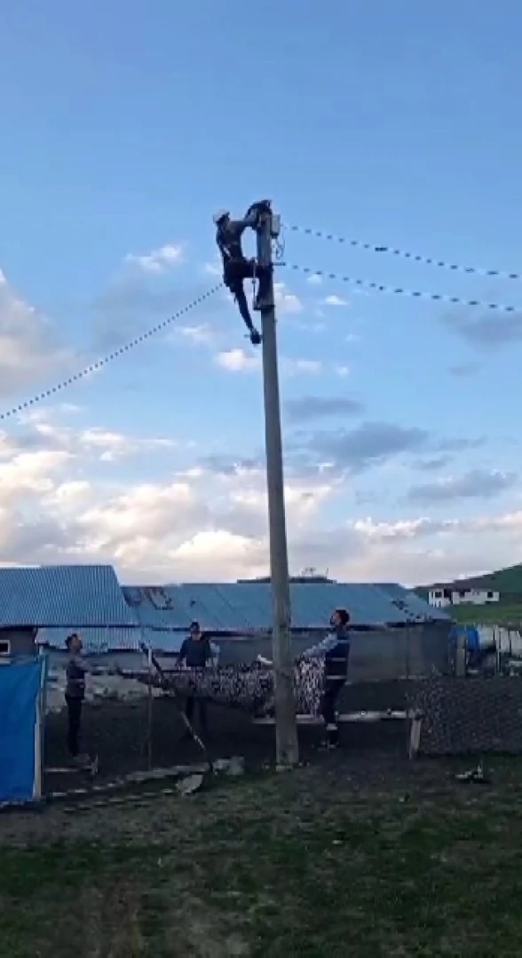 Bingöl’ün Karlıova ilçesindeki köyde köpeğin kovalaması sonucu elektrik direğine çıkan ve mahsur kalan kediyi, elektrik şirketinin personeli kurtardı.