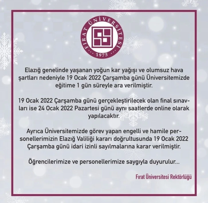 Fırat Üniversitesinden yapılan açıklamada, “Elazığ genelinde yaşanan yoğun kar yağışı ve olumsuz hava şartları nedeniyle 19 Ocak 2022 Çarşamba günü Üniversitemizde eğitime 1 gün süreyle ara verilmiştir. 19 Ocak 2022 Çarşamba günü gerçekleştirilecek olan final sınavları ise 24 Ocak 2022 Pazartesi günü aynı saatlerde online olarak yapılacaktır. Ayrıca Üniversitemizde görev yapan engelli ve hamile personellerimizin Elazığ Valiliği kararı doğrultusunda 19 Ocak 2022 Çarşamba günü idari izinli sayılmalarına karar verilmiştir. Öğrencilerimize ve personellerimize saygıyla duyurulur” denildi.