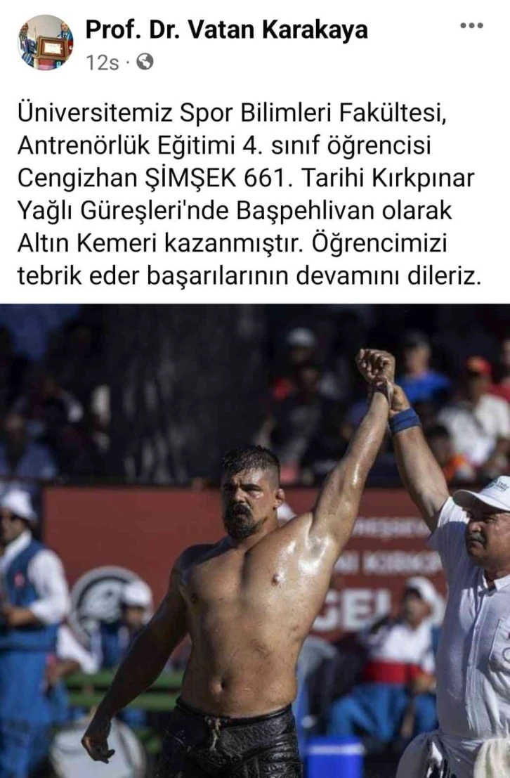 KAEÜ Rektörü Prof. Dr. Vatan Karakaya, öğrencinin başpehlivan olmasını sosyal medya hesabından, "Üniversitemiz Spor Bilimleri Antrenörlük Eğitimi 4. sınıf öğrencisi Cengizhan Şimşek, 661. tarihi Kırkpınar Yağlı Güreşlerinde başpehlivan olarak altın kemer kazanmıştır. Öğrencimizi tebrik eder başarılarının da devamını dilerim" notuyla paylaştı.