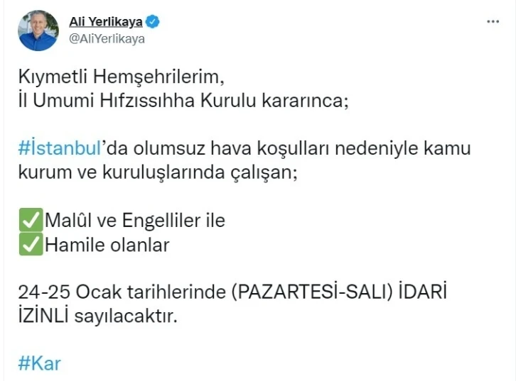 İstanbul Valisi Ali Yerlikaya sosyal medya hesabından yaptığı paylaşımda olumsuz hava koşulları nedeniyle İl Umumi Hıfzıssıhha Kurulu kararınca kamu kurum ve kuruluşlarında çalışan malûl ve engelliler ile hamile olanların 25-25 Ocak tarihlerinde idari izinli sayılacağını duyurdu.