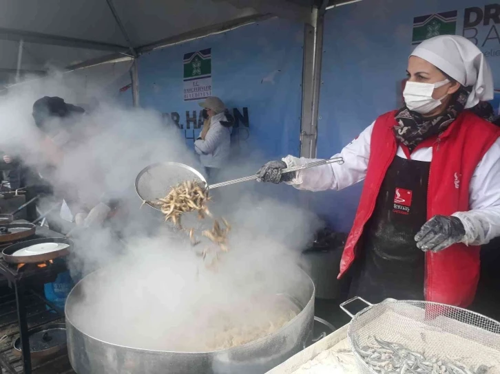 Bahçelievler’de kar altında düzenlenen hamsi festivalinde 3 ton balık ekmek ikram edildi.