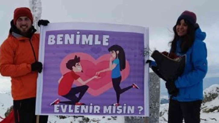 Zirvede açılan pankart önünde Diş Hekimi Aslı Tanrıverdi, Gökbulut’un sürpriz evlilik teklifini kabul etti. Renkli görüntülerin ortaya çıktığı o anlar, çiftin arkadaşları tarafından cep telefonuyla kaydedildi.