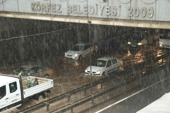 Kocaeli’de etkili olan sağanak sebebiyle caddelerde su birikintileri oluşurken, bazı alt geçitleri su bastı, araçlar yollarda kaldı.