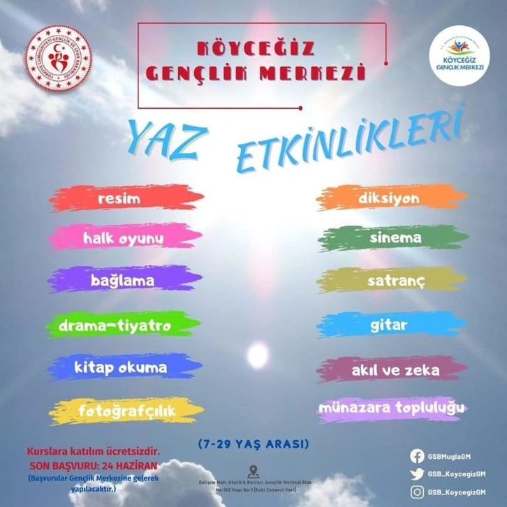 Muğla’nın Köyceğiz ilçesi Gençlik ve Spor İlçe Müdürlüğü Gençlik Merkezi Yaz kursları başvuruları başlıyor. Eğitim-Öğretim yılının tamamlanmasıyla birlikte başlayacak olan Yaz Kurslarına katılmak isteyen 7-29 yaş arası tüm gençler Köyceğiz Gençlik Merkezi’ne başvuru yaparak kurslardan ücretsiz faydalanabilecek. Resim, Satranç, Bağlama, Gitar, Fotoğrafçılık, Halk Oyunu, Drama-Tiyatro, Kitap Okuma, Münazara Topluluğu, Akıl ve Zeka, Sinema ve diksiyon branşlarında açılacak olan kurslara kayıtların okulların kapanmasıyla birlikte başlayacağı belirtildi. Başvurular 24 Haziran’da sona erecek. Ücretsiz kurslara kayıt için ve detaylı bilgi için Köyceğiz Gençlik Merkezine müracaat edilecek.