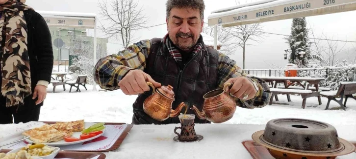 Bursa’da Uludağ eteklerinde bulunan köyde, karlı günlerde müşteriler, kahvaltılarını karların üzerinde yapıp keyifli zaman geçiriyor.