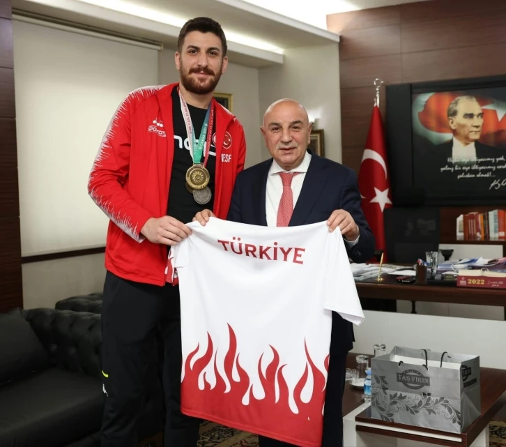 Keçiören Belediye Başkanı Turgut Altınok, 24. İşitme Engelliler Yaz Olimpiyat Oyunları’nda (Deaflympics) Ukrayna’yı mağlup ederek şampiyon olan İşitme Engelliler Erkek Voleybol Milli Takımı oyuncularından Mert Karataş ve ailesini makamında misafir etti.