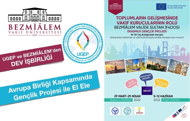 2022 yılı faaliyetlerine süratle devam eden Uluslararası Gençlik ve Eğitim Platformu (UGEP), Türkiye'nin seçkin üniversitelerinden Bezmi Alem Vakıf Üniversitesi ile "Toplumların Gelişmesinde Vakıf Kurucularının Rolü" başlıklı Avrupa Birliği Erasmus+ Gençlik projesiyle dev bir işbirliğiyle çeşitli faaliyetler yürütecekler. Avrupadan ve Türkiyeden çeşitli STK'larında yeralacağı projeyle özellikle gençlere, sivil toplum kuruluşlarının toplumsal gelişim sürecindeki rolü ve etkinliği vurgulanacak.