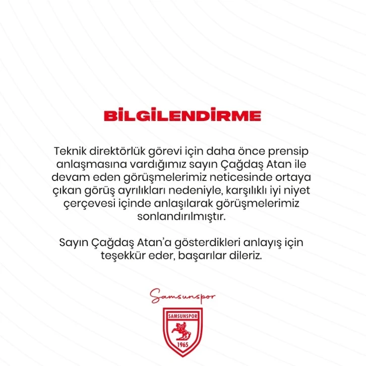 Samsunspor kulübü, teknik direktör çağdaş atan’la anlaşamadıklarını duyurdu.