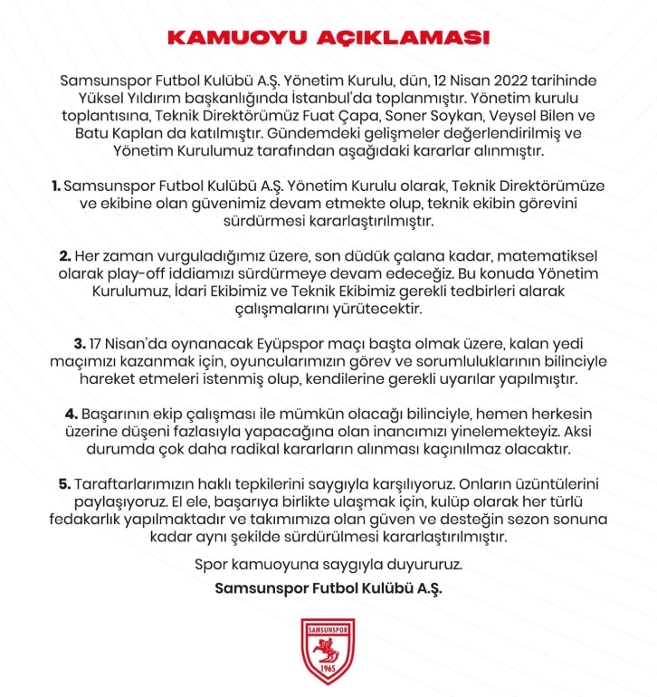 “Samsunspor Futbol Kulübü A.Ş. Yönetim Kurulu olarak, teknik direktörümüze ve ekibine olan güvenimiz devam etmekte olup, teknik ekibin görevini sürdürmesi kararlaştırılmıştır. Her zaman vurguladığımız üzere, son düdük çalana kadar, matematiksel olarak play-off iddiamızı sürdürmeye devam edeceğiz. Bu konuda yönetim kurulumuz, idari ekibimiz ve teknik ekibimiz gerekli tedbirleri alarak çalışmalarını yürütecektir. 17 Nisan’da oynanacak Eyüpspor maçı başta olmak üzere, kalan yedi maçımızı kazanmak için, oyuncularımızın görev ve sorumluluklarının bilinciyle hareket etmeleri istenmiş olup, kendilerine gerekli uyarılar yapılmıştır. Başarının ekip çalışması ile mümkün olacağı bilinciyle, hemen herkesin üzerine düşeni fazlasıyla yapacağına olan inancımızı yinelemekteyiz. Aksi durumda çok daha radikal kararların alınması kaçınılmaz olacaktır. Taraftarlarımızın haklı tepkilerini saygıyla karşılıyoruz. Onların üzüntülerini paylaşıyoruz. El ele, başarıya birlikte ulaşmak için, kulüp olarak her türlü fedakarlık yapılmaktadır ve takımımıza olan güven ve desteğin sezon sonuna kadar aynı şekilde sürdürülmesi kararlaştırılmıştır.”