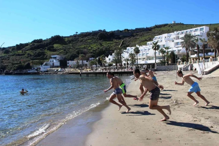 Karadağ’ın köklü kulüplerinden OFK Petrovac sporcuları, kamp için geldiği Bodrum’da sıcak havayı görünce dayanamayıp denize girdi. Karadağ’ın köklü kulüplerinden OFK Petrovac, geçtiğimiz hafta Azka otele kampa geldi. 1 haftadır kapta olan takım sıcak havayı görünce antrenmanı yarıda bırakıp denize girerek güneşli havanın tadını çıkardı. Bodrum’un en gözde koylarından biri olan Bardakçı Koyu’nda denize giren sporcular “Deniz çok sıcak hava çok güzel bizde bu fırsatı kaçırmadık” ifadelerini kullandı. Otelin sahilinde Şubat ayında yazı yaşayan sporcular, Karadağ’ın bu aylarda çok soğuk olduğunu ifade etti.