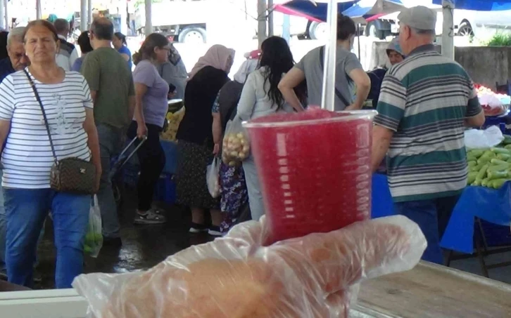 Muğla’nın Menteşe ilçesinde Perşembe günler kurulan halk pazarında kar şerbeti tezgahı açan vatandaş satışlardan memnun. Bardağı 5 liradan satılan kar şerbetine sıcak havadan bunalan vatandaşlar tezgahta hem nefesleniyor, hem de seriliyor.