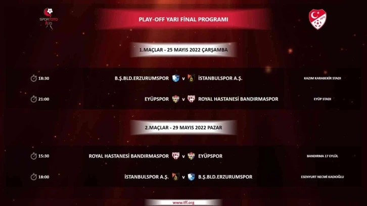 Spor Toto 1. Lig play-off yarı final maç programı belli oldu. Play-off yarı final ilk karşılaşmaları 25 Mayıs’ta, rövanş karşılaşmaları ise 29 Mayıs’ta oynanacak. Play-off yarı final müsabakalarının programı şöyle: