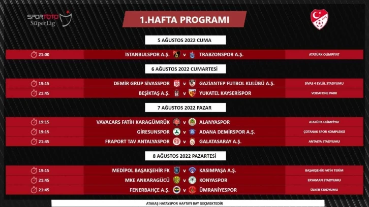 Bu değişikliklere bağlı olarak 5 Ağustos Cuma günü saat 19.15’te oynanacak olan İstanbulspor - Trabzonspor müsabakasının saati ise 21.00 olarak değiştirildi. Esenyurt Necmi Kadıoğlu Stadı’nda devam eden bakım onarım çalışmaları nedeniyle sezonun açılış müsabakası Atatürk Olimpiyat Stadı’nda oynanacak.