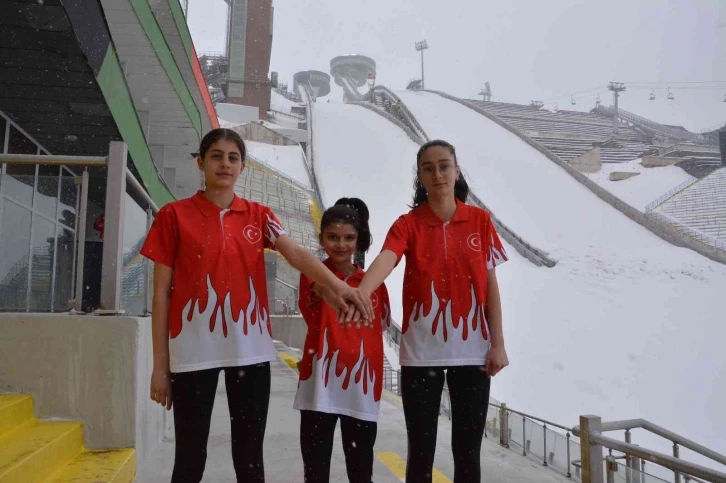 Erzurum Atlama Kulelerinde çalışmalarını sürdüren Aslıhan Güven (14), Elif Azra Şerefoğlu(12) ve Ravzanur Ekmekçi(13) Türkiye’yi Uluslararası arenada temsil etmek için çalışıyor.
