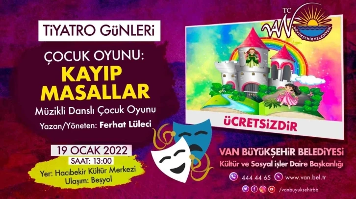 Çocuk ve gençlerin gelişimine katkıda bulunmak için çeşitli sanatsal ve kültürel etkinlikler düzenleyen Van Büyükşehir Belediyesi, merkez ve ilçelerde yapmış olduğu çalışmaları sürdürüyor. Bu kapsamda Kültür ve Sosyal İşler Dairesi Başkanlığı Hacıbekir Mahallesi Kültür Merkezinde çocuklara yönelik müzikli danslı çocuk oyunu düzenleyecek. Kayıp Masallar isimli çocuk tiyatrosu 19 Ocak saat 13.00’te ücretsiz olarak izleyicisi ile buluşacak.