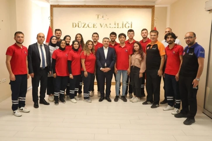 AFAD’ın Gençler ve Gönüllüler Yarışıyor etkinliği çerçevesinde, “Üniversiteler Arası Arama ve Kurtarma Yarışması”, “Afet ve Gönüllülük Konulu Fotoğraf Yarışması” ve “Liseler Arası Afetler Konulu Kompozisyon ile Afetlerde Gönüllülük Konulu Resim Yarışmasında” Düzce Üniversitesi’nden de öğrenciler katılım sağladı. 25 ildeki 32 üniversitede öğrenim gören toplam 448 öğrencinin katıldığı Üniversiteler Arası Arama ve Kurtarma Yarışmasının ardından ile dönen üniversite öğrencileri Vali Cevdet Atay ile bir araya geldi. Yaptıkları çalışmalar hakkında öğrenciler Atay’a bilgiler verdi.