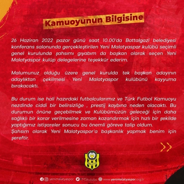 Yeni malatyaspor kulübünün resmi sosyal medya hesabından açıklama yapıldı