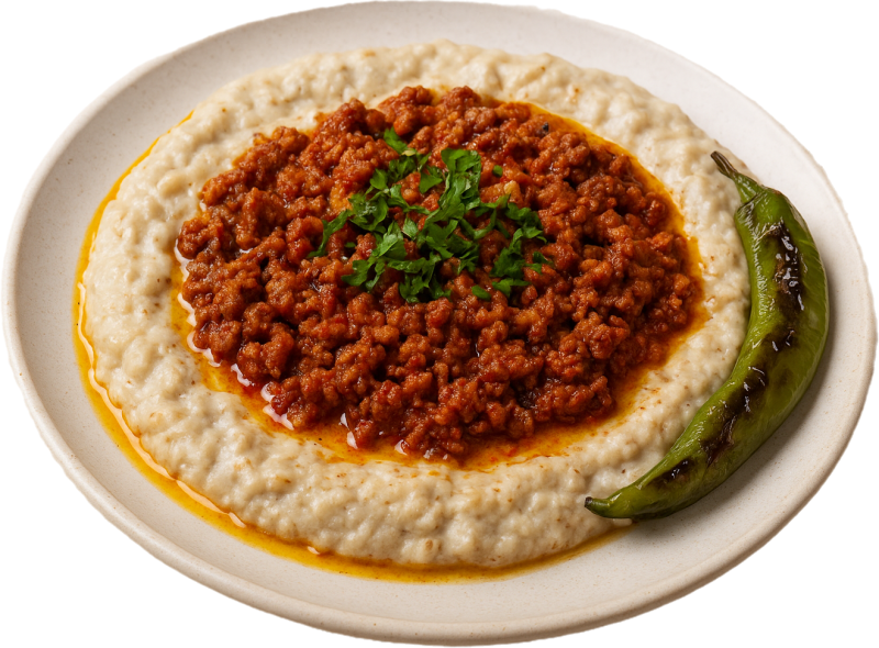 Köz kokusuyla yoğunlaşan patlıcan, üzerinde narin baharatlarla harmanlanmış sıcak kıyma... Alinazik; tarihî bir lezzetin modern sunumla buluştuğu, sofraya derinlik ve zarafet katan özel bir yemektir.