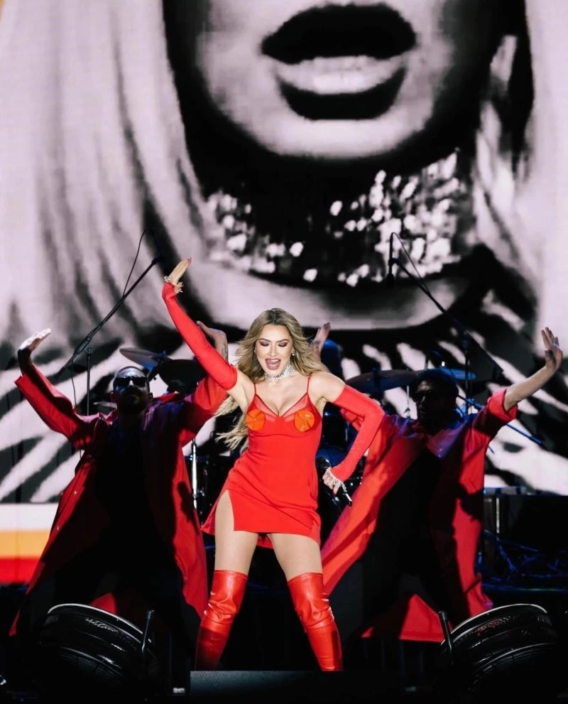Tam bu noktada sahne ışıkları yanıyor ve Hadise çıkıyor karşımıza.