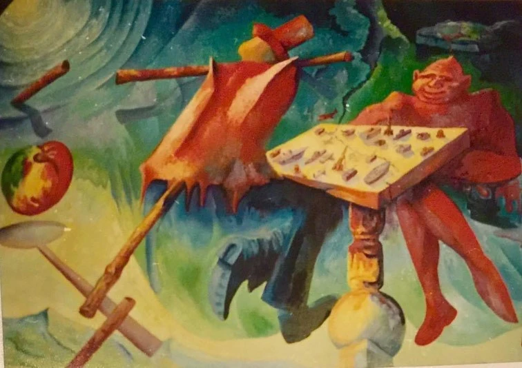 Bu masa, iktidarın sembolü olarak okunabilir. Masanın üzerindekiler, yönetilenlerin kader taşları ya da satranç taşları gibidir. Sanatçı burada bireylerin kaderinin nasıl bir “oyun tahtasında” belirlendiğini, toplumun nasıl manipülasyonlarla yönlendirildiğini ima ettim. Karşısında ise bedensiz bir forma bürünmüş “boş giysi”, insanın içinin boşaltılmış, kimliğinin soyulmuş hâlini temsil eder. Bu figür, modern insanın simgesidir: kıyafetleri, unvanları, toplumsal rolleri vardır ama ruhu eksiktir. Adeta kendisini dünyanın jandarması sanan kapitalist bloku simgeliyordu. Karşısında da adeta “ayıya” benzeyen tipleme ile komünist rakiplerini gösteriyordu.