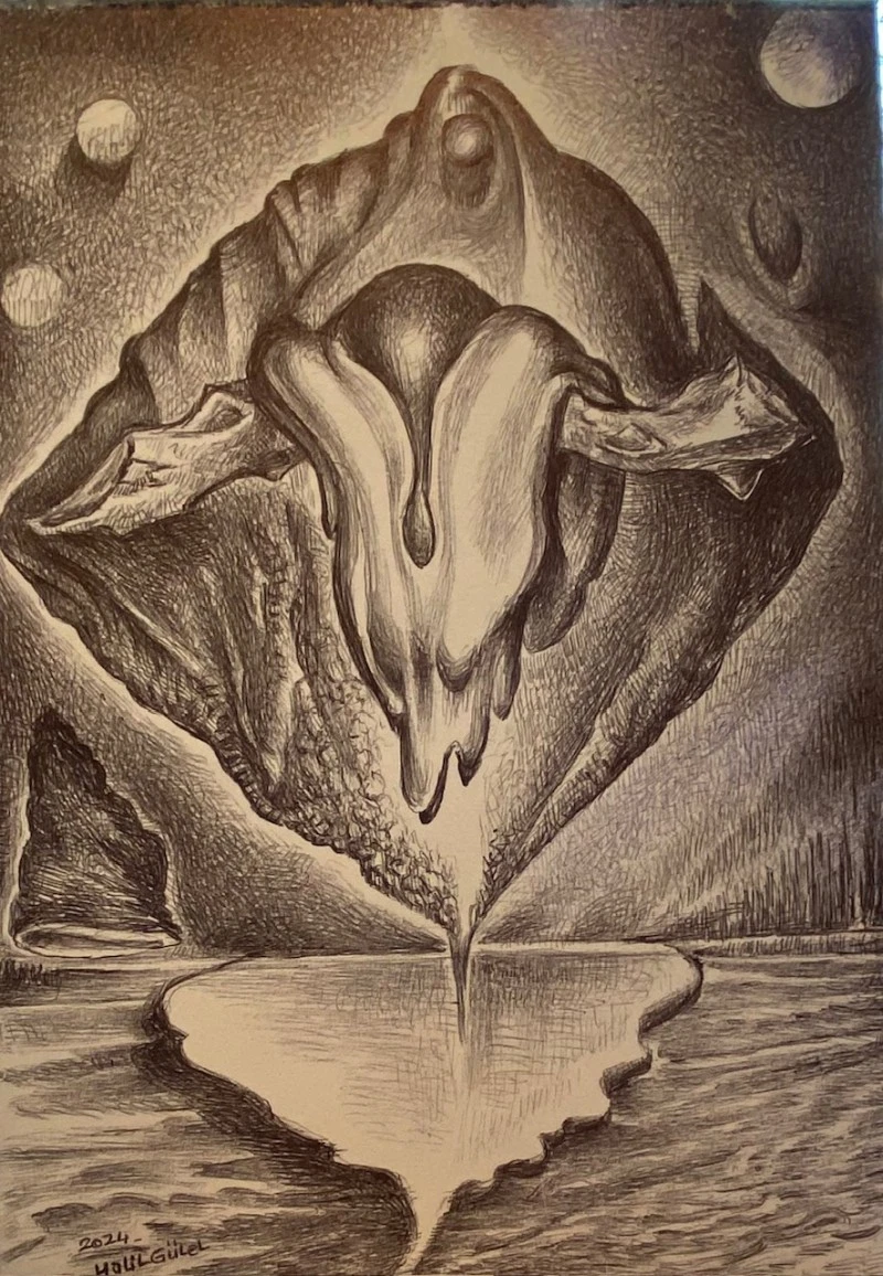 Arka plandaki kozmik unsurlar, uçsuz bucaksız bir evren hissi yaratırken, ön plandaki eriyen ve damlayan figür, insanın doğa ve evrenle olan bağlantısını sorgulatan bir metafor işlevi görüyor. Belki de sanatçı burada, insanın kendini sürekli yeniden inşa eden doğasını ve dönüşüm sürecini görselleştirilir. Düşsel dünyaların sınırlarını zorlayan ve çok katmanlı bir anlam taşıyan bu çizim, sanatın bilinçaltı keşfi üzerindeki etkisini vurgulayan etkileyici bir çalışma olarak değerlendirilebilir.