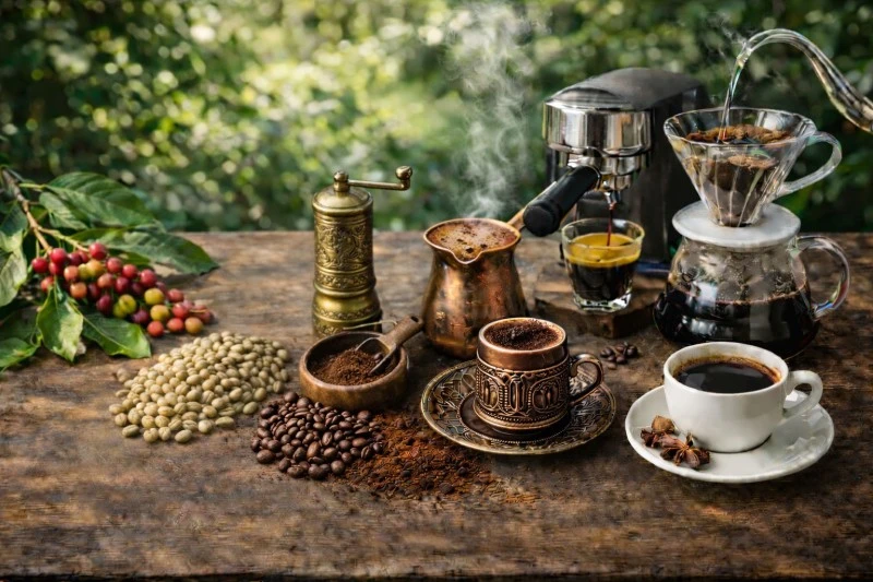 Hazırlama yöntemi bu algıyı doğrudan etkiler. Türk kahvesinde demleme, suyun sıcaklığının kademeli olarak yükselmesiyle gerçekleşir; zaman, ısı ve öğütüm birlikte çalışır. Filtre kahvede ise çözünme, büyük ölçüde sabit ve kontrollü bir sıcaklık aralığında ilerler. Espresso ise farklı bir teknik zemine sahiptir: kahve burada demlenmez, basınç altında ekstrakte edilir. Sonuç, süre, öğütüm kalınlığı, doz ve akış kontrolü arasındaki dengeye bağlıdır.
