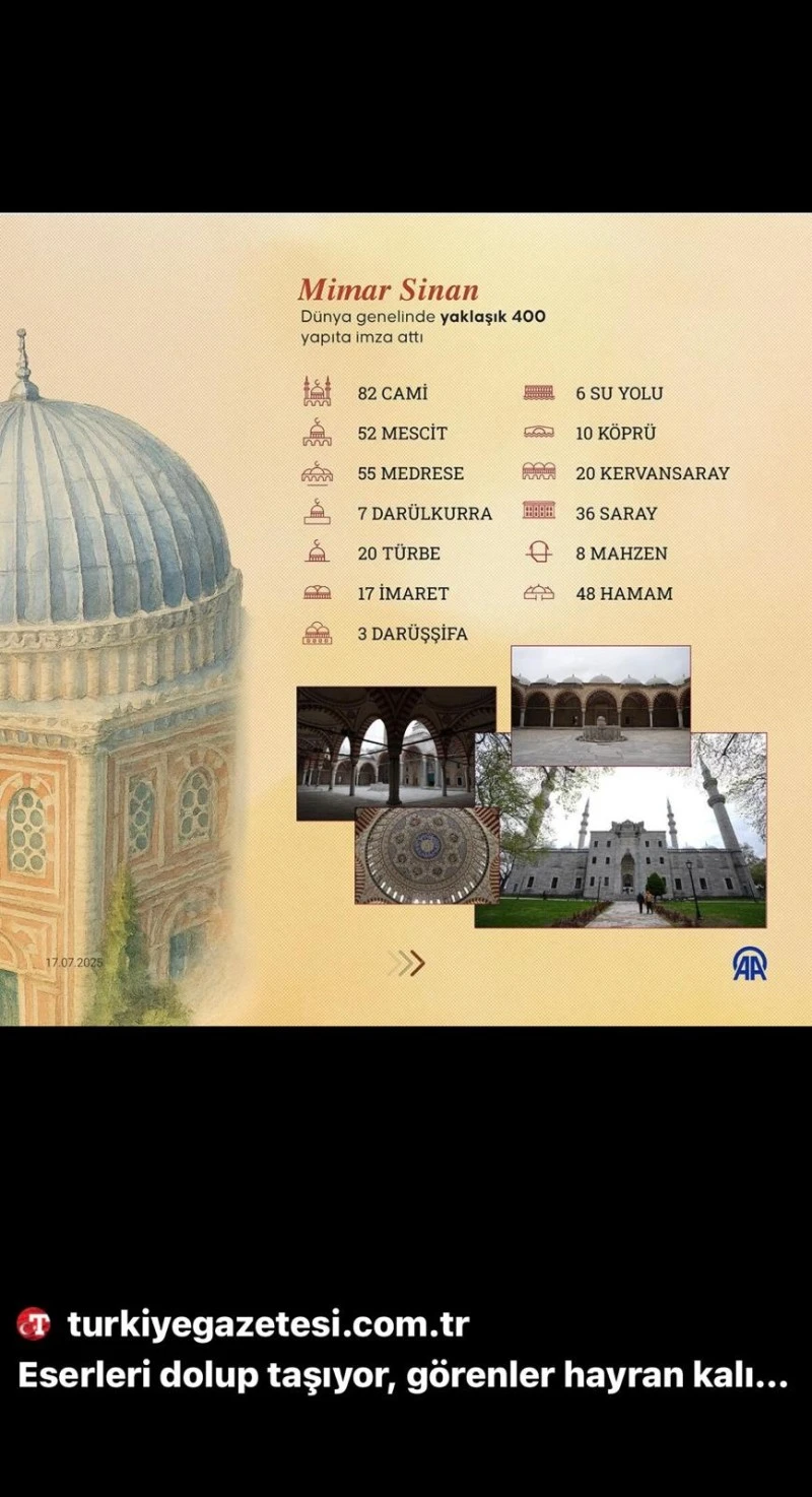 Kaynaklara göre 300’ün üzerinde eser bıraktı. Bu sayıdan daha etkileyici olan ise şu: Bugün hâlâ ayakta olan, hâlâ kullanılan ve hâlâ hayranlık uyandıran yapılar…