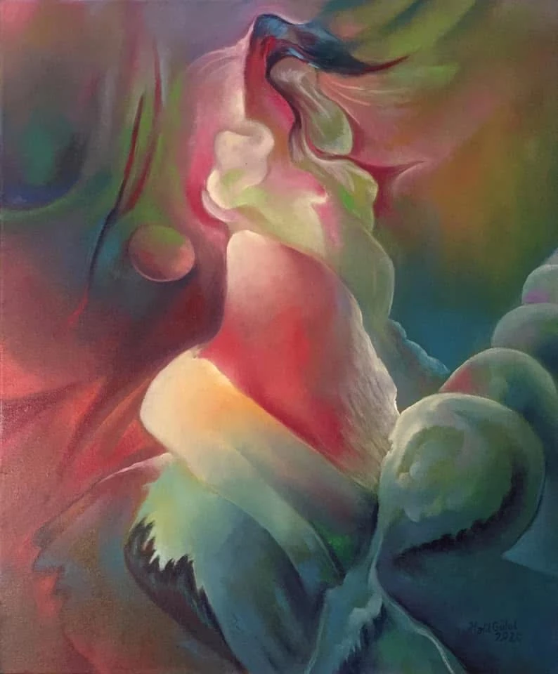 50x60 cm boyutundaki bu eser, yüzeyi tamamen dolduran renk katmanlarıyla izleyiciyi bir duygular peyzajına davet eder. Merkezdeki figüratif çağrışımlar - yükselen bir yüz profili, dalgalanmış bir beden kıvrımı ya da hayale bürünmüş bir siluet - somut bir varlık değil, “duygunun biçimleşmiş hali”dir. Burada figür, salt bir beden olmaktan çıkar; içsel bir titreşimin, bir ruh halinin görsel karşılığına dönüşür.